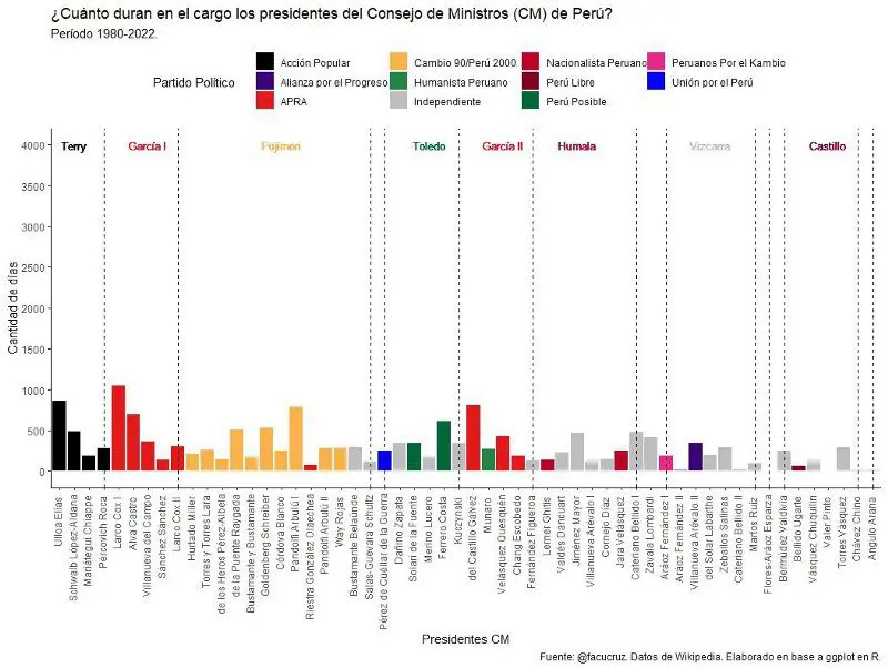 Pero los presidentes no son los únicos que duran poco. Antes te comenté que Perú es un presidencialismo, pero uno raro. Por la sencilla razón de que el presidente del CM es una especie de jefe de gabinete pero que se tiene que someter a la voluntad del Poder Legislativo para que aprueben su designación, junto a la de todo el equipo ministerial. Esta figura es, también, una forma de ver qué equipo arma cada mandatario peruano, de dónde viene y cuánto dura en el poder. Así las cosas, desde 1980 en adelante.