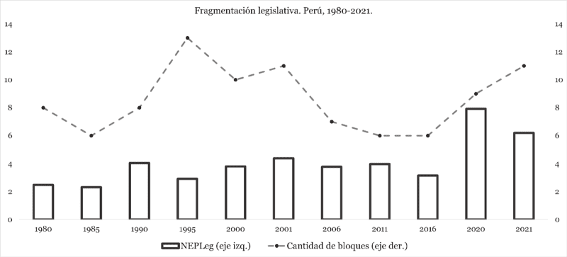 Otra vez, no es algo nuevo. Es algo que se remonta al período post PPK. Las elecciones extraordinarias del año 2020, convocadas por Martín Vizcarra luego de exitosamente disolver el Congreso, generó no solo un salto en la cantidad nominal de bloques legislativos sino también en términos de su fragmentación efectiva. Dado que ambas medidas tienen la misma escala, que la barra esté cerca de la línea de tendencia significa que las 130 bancas se las repartieron entre varios en partes muy parecidas. Un valor entre 8 y 10 quiere decir que, en promedio, tuvieron unas 13 bancas cada uno. Anda a construir una mayoría. Con la elección de Castillo hubo una compresión efectiva que bajó hasta 6, pero que nominalmente siguió subiendo hasta 11. Siguen siendo valores muy altos, poco usuales en Perú. Más cerca de Israel, Italia o Brasil que de Uruguay.