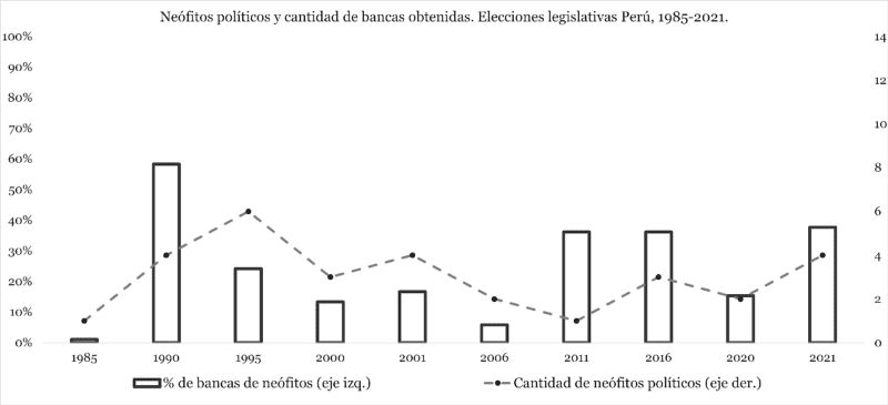 Este último gráfico tiene otro dato. Remite a las elecciones generales de 1990. Fueron las que vinieron después de una escalada hiperinflacionaria en el primer gobierno de Alan García, las del terrorismo de Sendero Luminoso y las que enfrentaron a dos neófitos por definición, como él y él. En esas elecciones, la cantidad de nuevos sube a cuatro respecto de la elección anterior, pero acumulan más de la mitad del Congreso. Todo terminó en el autogolpe de 1992. La historia no siempre absuelve, pero muchas veces enseña.