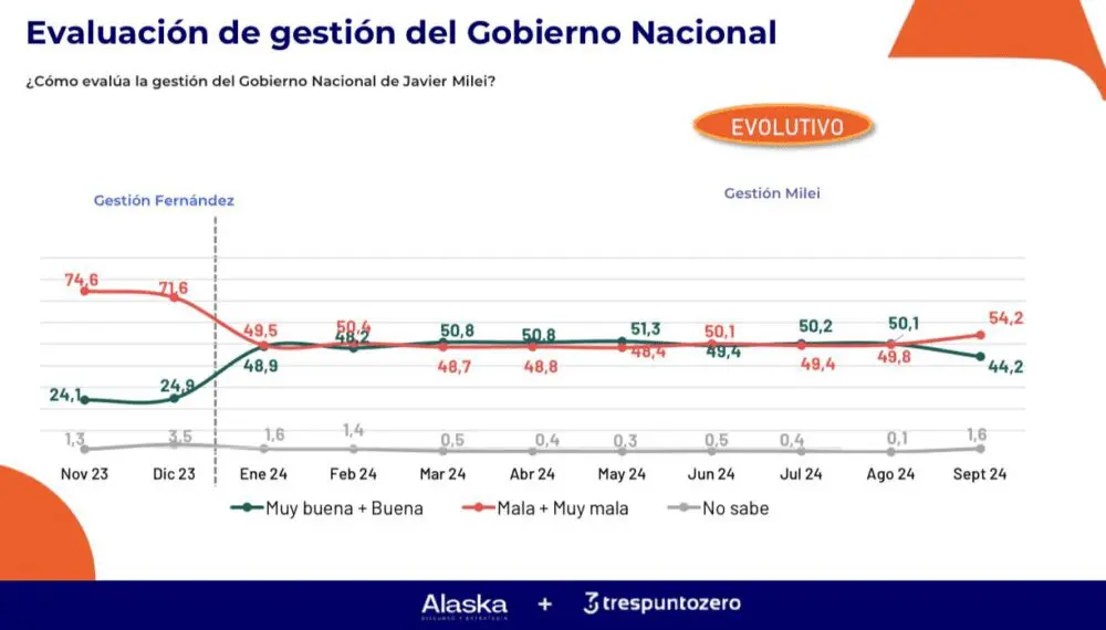 Es así, pero la razón es menos amable. El libertario desempolvó el fantasma K como antídoto para salir de un septiembre crítico. La inflación –por tercer mes consecutivo- arriba de los 4 puntos, la suba de tarifas, el fallido show del presupuesto y el veto (entre festejos y pactos con la casta) al aumento jubilatorio que, encima, Milei quiso festejar con un asado en Olivos. Algo se quebró. Dos consultoras detectaron una caída en la imagen de Milei. El estudio de Alaska, de Juan Courel, y TresPuntoZero, de Shila Vilker, tuvo un empate técnico en 50% de enero a agosto, pero en septiembre la negativa subió a 54 y la positiva cayó a 44. Federico Aurelio, de ARESCO, registró una baja de 4 puntos.