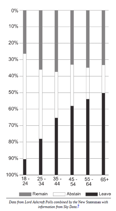 Estudios posteriores demostraron que los niveles de participación fueron menores en zonas de apoyo más fuerte a “Permanecer”. Los no votantes eran “proporcionalmente más jóvenes, inquilinos y miembros de minorías étnicas”. Una segunda hipótesis se ponía en cuestión. Se había dicho al inicio que la fuerza que empujó el “Permanecer” había sido principalmente la de los jóvenes. Era cierto, pero en proporción, no en votantes totales. Analizado de esta manera, la mayoría de los jóvenes no había votado ni por “Permanecer” ni por “Abandonar”: no habían votado. Una vez estimado el nivel de participación, quedaba claro que la opción de “Permanecer” había sido sostenida por votantes de entre 35 a 44 años. Otra vez, la narrativa inicial enfrentaba dificultades.