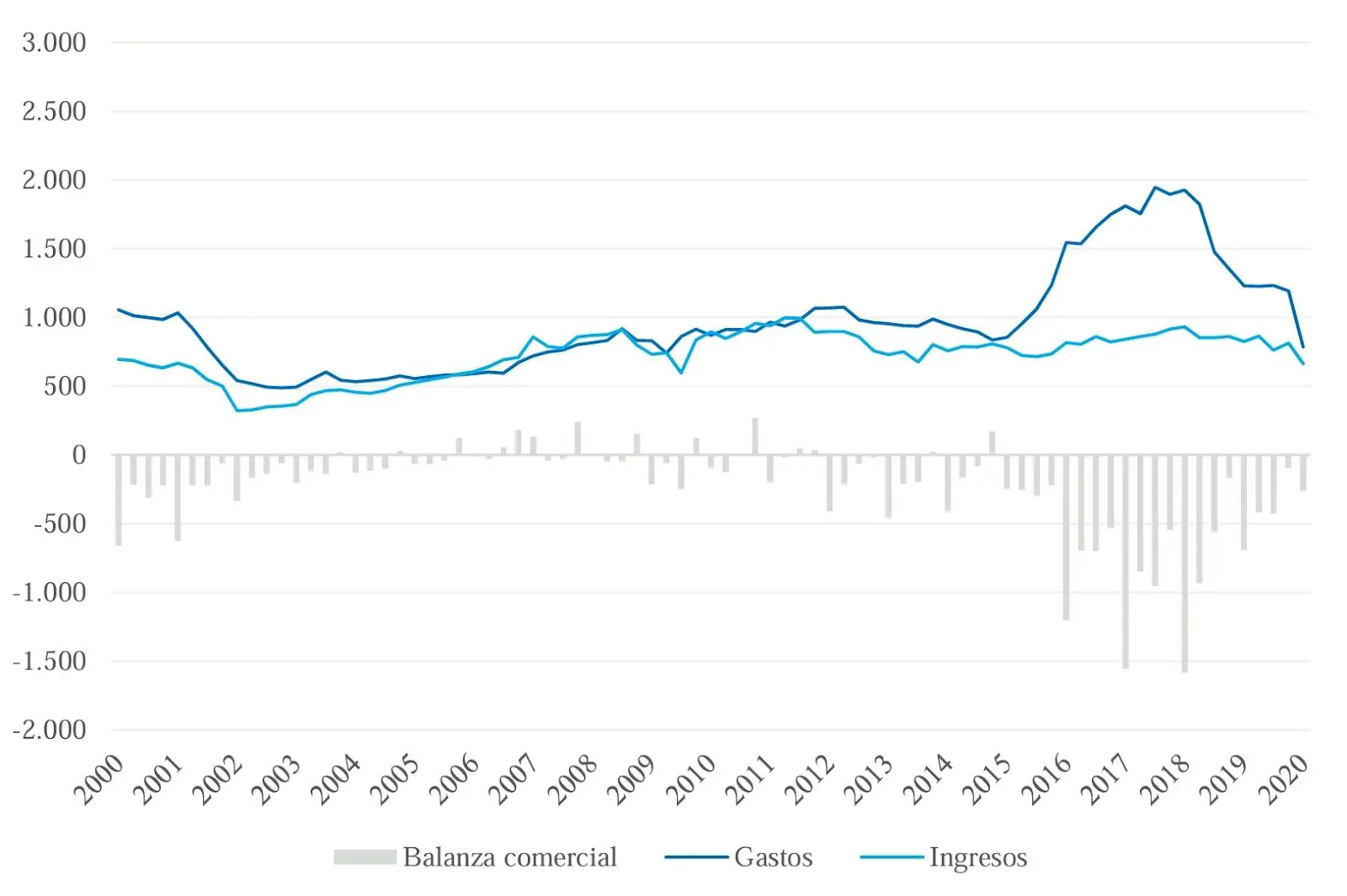 Gráfico. Ingresos y gastos en conceptos de turismo. Millones de dólares corrientes. 2000-2020