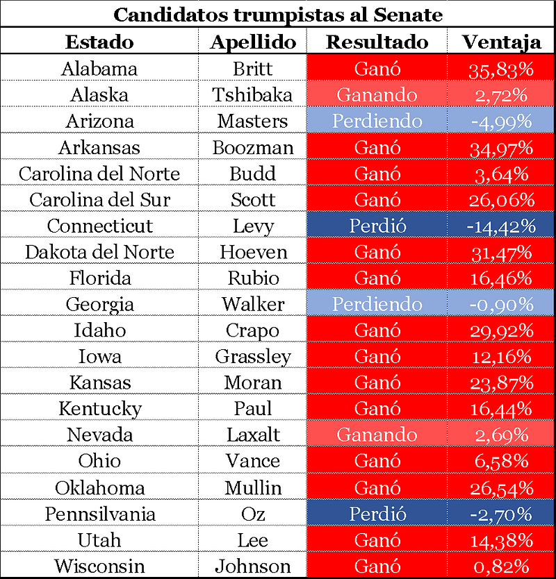 El resultado, sin embargo, fue más variado. En las carreras ejecutivas subnacionales, al momento de escribir esta nota, los candidatos que apoyó Trump ganaron 7 y perdieron 6. Todas ellas con comodidad, no fueron elecciones peleadas. Para ninguno de los dos bandos. Hay tres en carrera, de las cuales dos las estarían ganando (Alaska y Nevada) y una perdiendo (Arizona). Esto deja una situación bastante ajustada para que su nombre siga apareciendo en los afiches, spots y campañas estatales.
