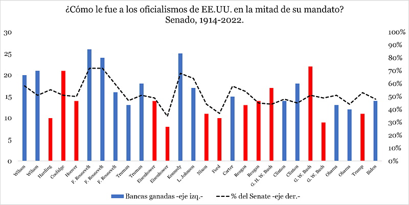 Biden, acá también, hizo un papel digno. Mejores resultados que Obama en el recinto, parecido a Clinton, Carter y Johnson. Aún lejos del poderío de Kennedy y FDR (1934 a 1942). La historia lo está salvando antes que las encuestas. No es menor. Solo dos veces en la historia el partido en el gobierno aumentó los escaños en las mid-term: FDR en 1934 y Bill Clinton en 1998.