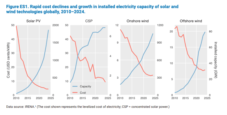Los datos son elocuentes. En 2024, las energías renovables representaron el 92.5% de toda la nueva capacidad eléctrica añadida en el mundo. Los costos de generación eléctrica a partir de solar fotovoltaica y eólica terrestre son ya 41% y 53% más baratos, respectivamente, que las alternativas fósiles más económicas. El capital lo sabe: la inversión global en energías limpias superó los 2 billones de dólares por primera vez en la historia y duplicó al gasto en fósiles. En términos de empleo, el sector de energía limpia creó más puestos que los combustibles fósiles (34.8 millones contra 32.6 millones), con China, la UE y Brasil liderando. Y en movilidad, los autos eléctricos pasaron de representar el 1% de las ventas globales en 2015 al 20% en 2024.