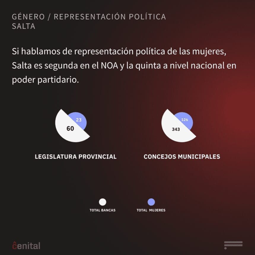 Si hablamos de representación política de las mujeres, Salta es segunda en el NOA y la quinta a nivel nacional en poder partidario: en las últimas elecciones, el 46% de las listas estaban encabezadas por mujeres. Sin embargo, el poder de decisión no tiene tan buenos indicadores. De un gabinete de ministros de 9 personas sólo hay una mujer, y en un total de 60 municipios sólo hay cuatro intendentas.