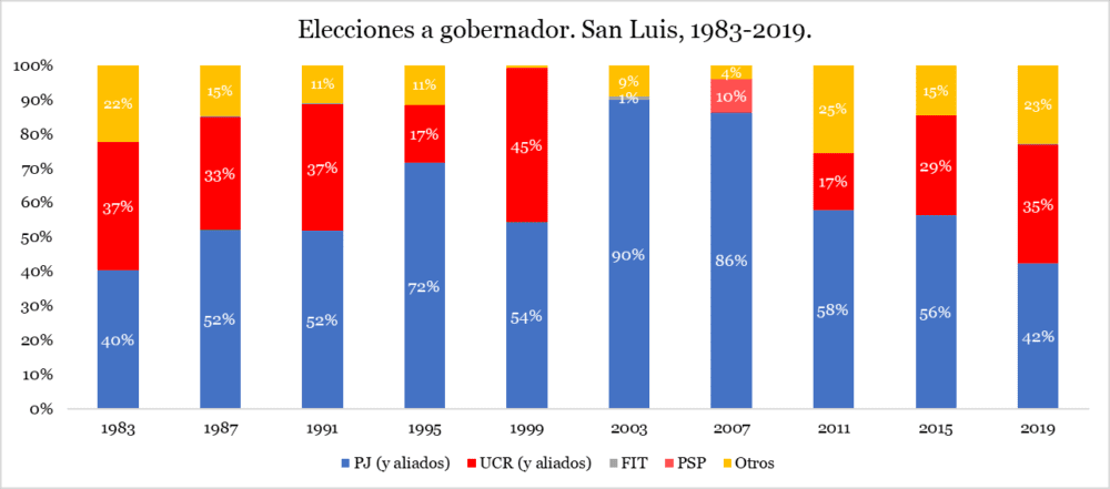 Tal como podes observar, el PJ siempre estuvo arriba de la mitad del electorado puntano. Salvo los casos de 1983 (la primera de Adolfo) y 2019 (la última de Alberto) nunca perforó ese piso. Hasta llegó a niveles africanos en 2003, cuando el más joven de los dos ganó su primera vez en el sillón familiar. Te dije, sultanato. Esa elección, de hecho, coincidió con el primer juego presidencial de los Rodríguez Saá, con Adolfo saltando de nivel con el Movimiento Popular Unión y Libertad. San Luis fue la única junto a La Rioja que se pegó a esa presidencial rara y adelantada para abril. Los hermanos repitieron el juego y el reparto de roles en 2007, 2011 y 2015. Solo en las de 2011 la cara fue del menor. En todas las demás, el saltarín fue el mayor.