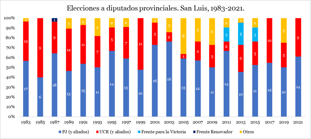 Salvo en contados casos (1983, 1999 y 2013), siempre ganaron la mitad de las bancas en juego. Y cuando no pudieron, se quedaron al menos con el 40%. Lo cual no es un mal resultado para un esquema de renovación parcial como tiene la provincia por la sencilla razón de que si en la anterior te fue bien y tuviste a todos contentos, no perdés la mayoría del recinto. El gráfico te deja también dos datos que son particularidades puntanas. La primera es que hay poco espacio para otros partidos, situación calcada de la competencia Ejecutiva. Salvo que uno corra dentro del PJ o dentro de la UCR (hoy Juntos por el Cambio) es difícil lograr algo. Incluso una banca. La segunda es que cuando el Frente para la Victoria quiso entrar con fuerza, como ocurrió a partir de 2011, el resultado no fue el esperado. El PJ de los Rodríguez Saá parece impenetrable.