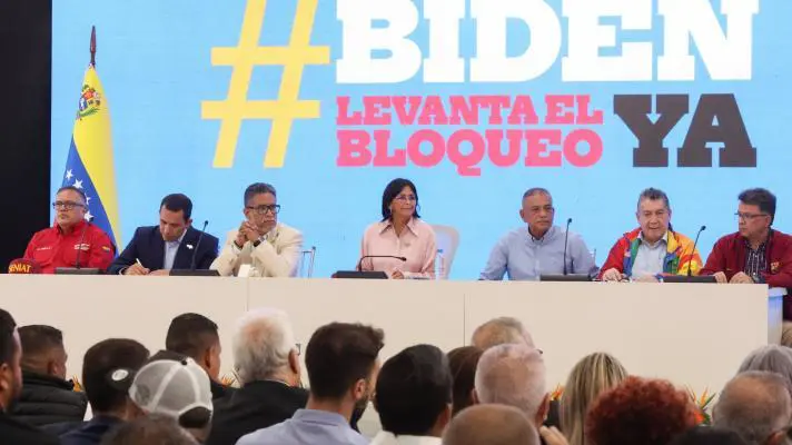 La vicepresidenta ejecutiva, Delcy Rodríguez, y una consigna contra el gobierno estadounidense tras la no renovación de la Licencia 44. Foto: @ViceVenezuela