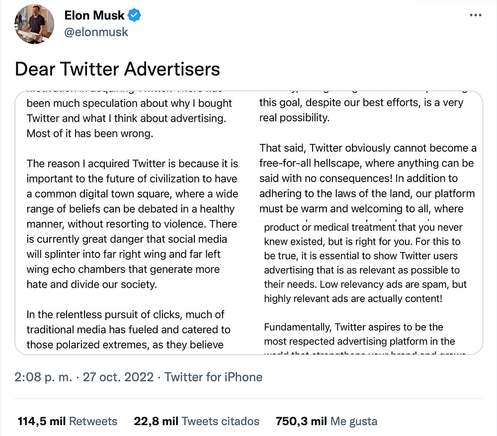 En su mensaje dice algunas cosas clave. En primer lugar, Elon ya parece desdecirse de cosas que dijo antes, de que en la plataforma íbamos a estar todos diciendo lo que queríamos y molestándonos los unos a los otros. Esto empieza con los motivos por los que compró Twitter: “La razón por la que adquirí Twitter es porque es importante para el futuro de la civilización tener una plaza pública digital común, donde se pueda debatir un amplio rango de creencias de manera saludable, sin recurrir a la violencia”. Después se pone más poético: “Lo hice [comprar Twitter] para tratar de ayudar a la humanidad, a quien amo”. Por todo esto, cree que debe haber algunas reglas en el uso de la plataforma: “Dicho esto, Twitter obviamente no puede convertirse en un infierno de todos contra todos, donde se puede decir cualquier cosa sin consecuencias”.