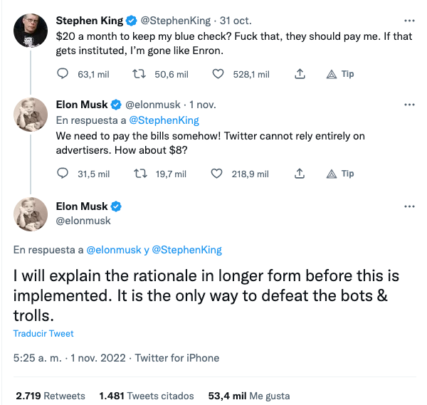 Entonces, como multimillonario obsesivo que se ocupa de todo, Musk propuso y luego negoció pagar por un servicio verificado. Primero dijo que 20 dólares, pero luego en conversaciones se desdijo. Acá abajo podés ver su conversación con Stephen King dónde ante la queja del escritor (que se ve que sabe quién genera contenido en la red porque dice “deberían pagarme a mí”) Elon baja el precio a 8 y promete “explicar la lógica detrás de esto antes de que se implemente. Es la única manera de derrotar a los bots y los trolls”.