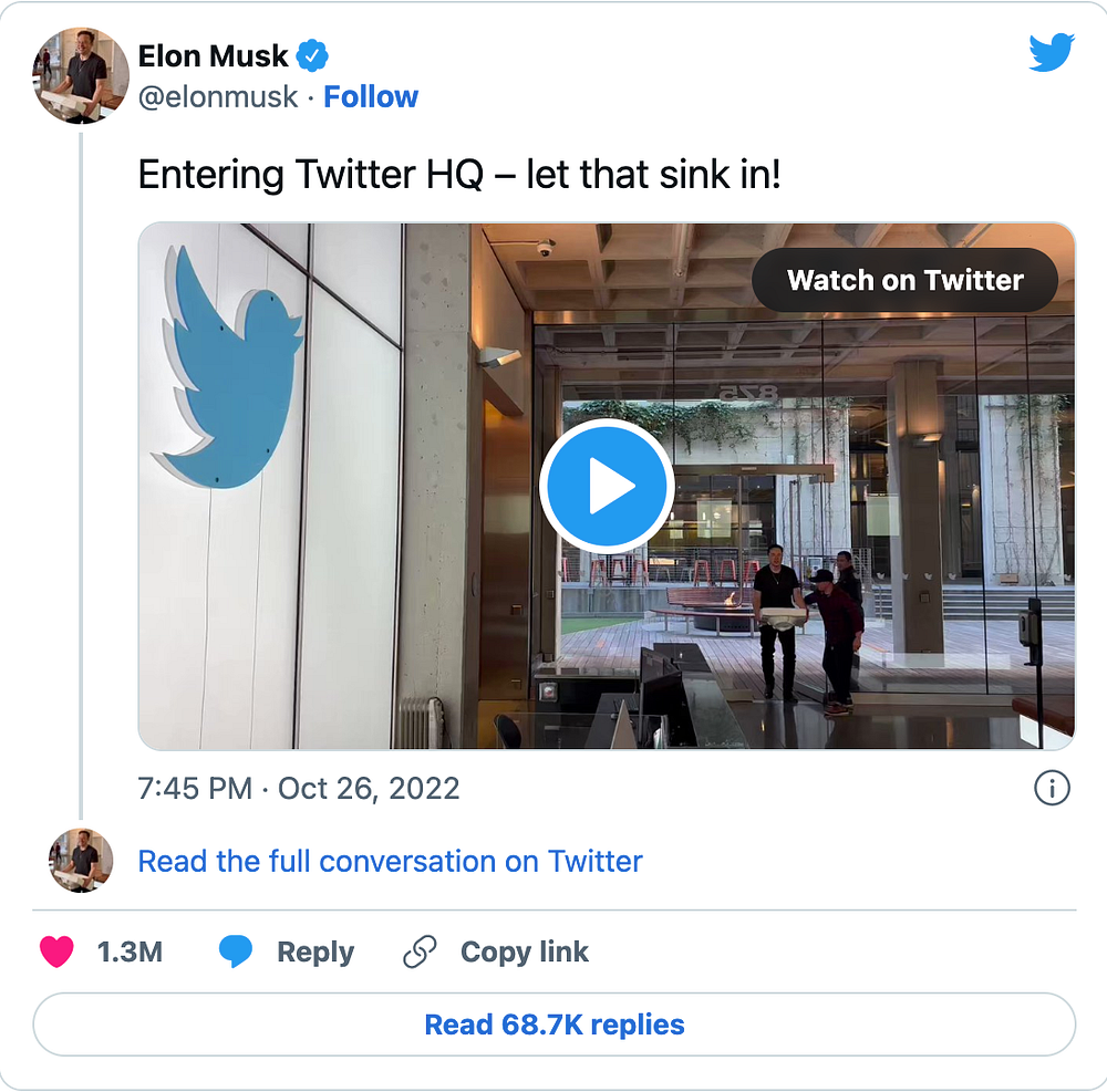 Toda esta novela fue objeto de varios newsletters (este sobre el momento en que dijo que la compraba y este acerca del lapso en que se arrepintió) porque Elon venía amagando con comprar Twitter desde hace tiempo. Ahora finalmente sucedió. ¿Qué cosas pasaron desde la compra? Menciono cuatro: la incapacidad de Elon para la comedia (incluída la comedia física), el despido de la plana mayor de Twitter, el mensaje a las empresas que ponen publicidad en Twitter y la propuesta de cobrar por el tick azul de verificado. Veamos.
