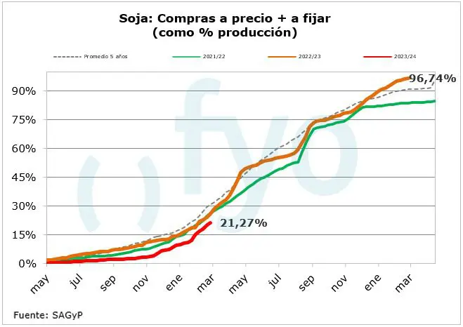 Sin embargo, en las últimas semanas, los ritmos de ventas fueron sostenidos, apuntó Preciado Patiño a Cenital: 900.000 toneladas de maíz y 600.000 toneladas semanales de soja. Como el 60% del maíz temprano ya se cosechó y recién se levantó entre el 5 y 10% de la soja, distintos especialistas coinciden en que los productores harán caja con el maíz temprano y esperarán lo más que puedan para desprenderse de la soja. Hasta fines de marzo, las ventas de oleaginosa vienen demoradas, según los datos oficiales que relevó FyO.