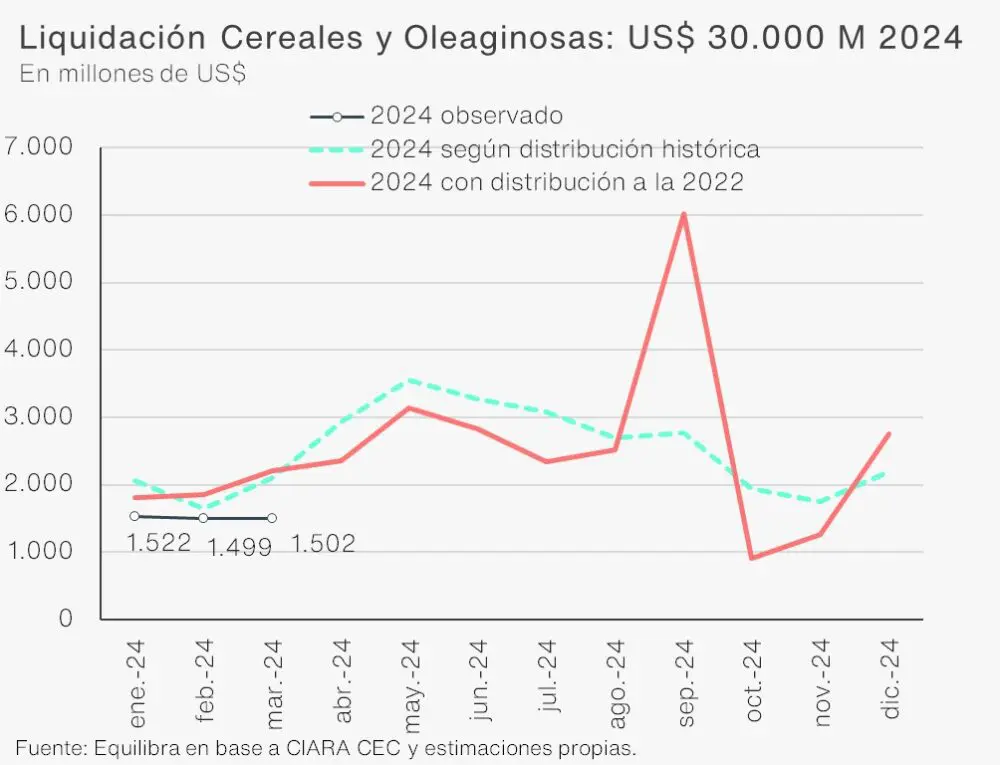 Las condiciones para el agro no son idóneas. La cosecha fue algo peor a lo esperado y el precio internacional de la soja no para de caer. Según la consultora Equilibra, “el precio efectivo que reciben los exportadores por tonelada de soja vendida es casi la mitad al de diciembre post-devaluación y se ubica 15% por debajo del mínimo de junio de 2023”. Por eso, la consultora estimó que las liquidaciones vendrán “por debajo de su ritmo histórico”, a la espera de “algún incentivo, como sucedió en 2022 con el ‘dólar soja’”. En aquel entonces, el agro retuvo la cosecha hasta que, en septiembre, la ventana exportadora disparó las ventas.
