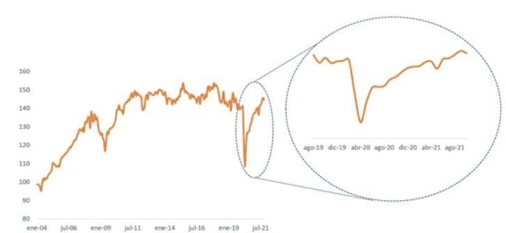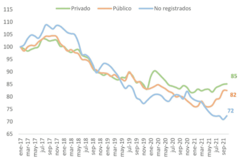Evolución de los salarios en términos reales (enero 2017 = 100)