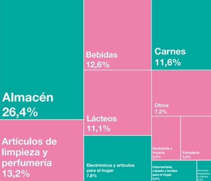 Al desglosar según el canal de las ventas, se observa que aquellas realizadas de manera online se estabilizaron luego del fuerte incremento que mostraron en 2020 por la pandemia, y que siguen representando una parte ínfima en relación a las compras hechas de manera presencial (4% del total, frente al 96% restante que se realiza de manera presencial). En cuanto a los rubros, como muestra el gráfico a continuación, predominan las compras asociadas a productos de almacén, limpieza, carnes, lácteos y bebidas.
