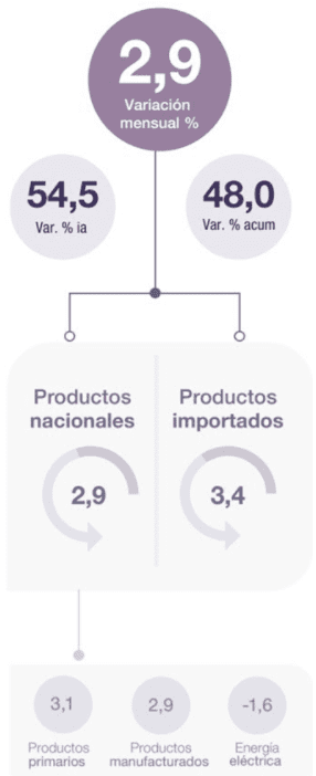 Al analizar los componentes, se observa que hubo un incremento en los productos importados (3,4% mensual frente al 2,3% del mes pasado), en los productos primarios (3,1% vs. 2,8%) y en los productos manufacturados (2,9% vs 2,8%) que fueron neutralizados por la fuerte caída que se observó en el precio de la energía (-1,6% vs. 9,2%).