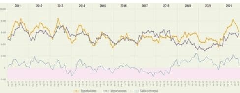 En noviembre el saldo comercial volvió a mostrar un superávit, aunque menos holgado que en los meses anteriores (USD 400 millones). Las exportaciones fueron de USD 6.160 millones, mientras que las importaciones fueron de USD 5.760 millones. Así, el resultado comercial fue superavitario en los once meses del 2021, acumulando un saldo de USD 14.340 millones, el más alto de los últimos 10 años.