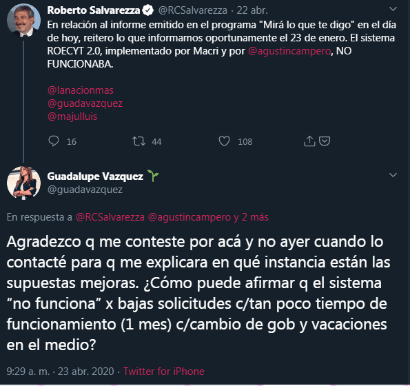 El 22 de abril, la periodista Guadalupe Vazquez emitió un informe llamado “El negocio de la ciencia” en el programa “Mirá lo que te digo” conducido por Luis Majul. En él, denunciaba que el 21 de enero, a solo un mes de su implementación, el Ministro Raúl Salvarezza había dado de baja el sistema ROECYT 2.0, destinado a la importación de insumos para investigación. Los principales puntos del argumento de Vázquez fueron: