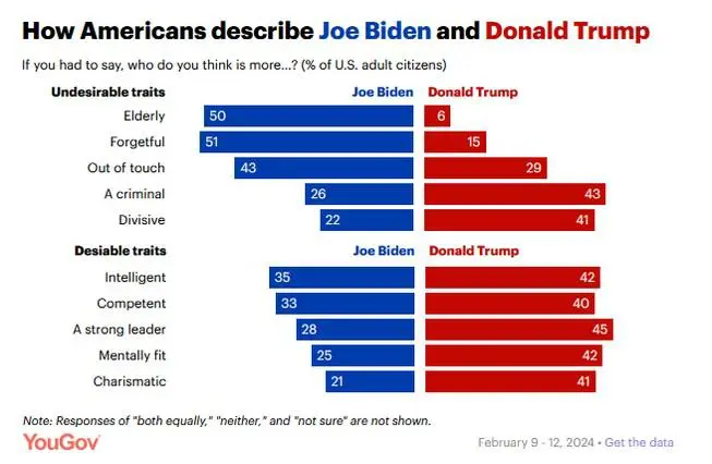 Biden y Trump son de la misma generación: el actual presidente tiene 81 años y el magnate, 77. Sin embargo, el 50% de los estadounidenses encuestados por YouGov considera anciano (elderly) al demócrata y apenas un 6% hace lo propio con el republicano. Una diferencia abismal. Biden también toma la delantera en las categorías olvidadizo (forgetful) y alejado de la realidad (out of touch). Cuando se le pregunta a los entrevistados si los candidatos están mentalmente en forma (mentally fit), Trump supera casi en 20% el guarismo de Biden.