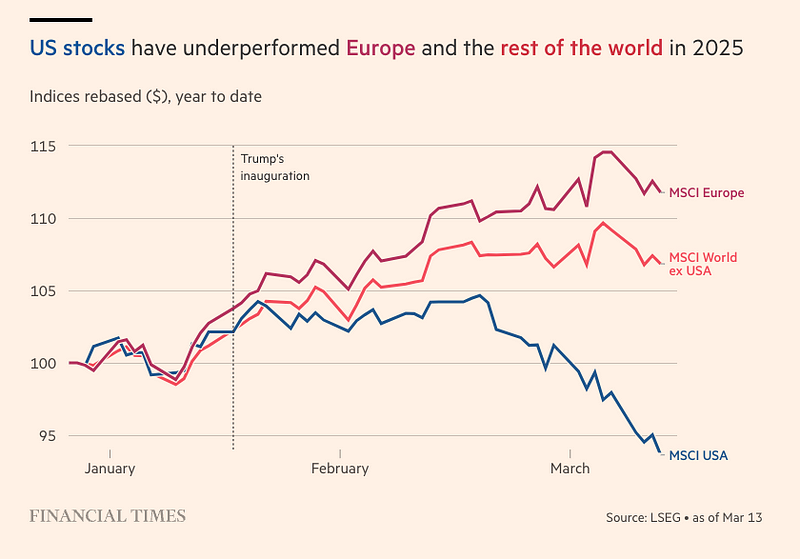Desde que comenzó el 2025, el índice S&P 500 –uno de los índices bursátiles más importantes de Estados Unidos– perdió 4 puntos porcentuales. Y no es una dinámica global, como lo muestra el siguiente gráfico.