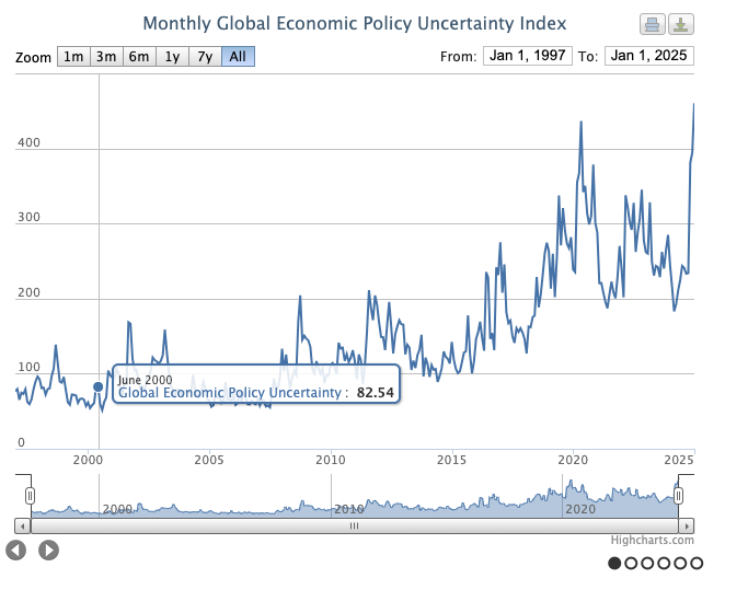 El resultado, como señalamos la semana anterior, es que las dos palabras claves que circulan en el mercado son incertidumbre y desconfianza. Esto enfría el sentimiento del mercado y provoca advertencias de recesión. Si te interesa hacer un seguimiento del clima del mercado, te recomiendo que mires dos bases de datos bien interesantes. La primera es el Economic Policy Uncertainty Index, un índice desarrollado por Scott Baker, Nicholas Bloom y Steven Davis para medir la incertidumbre en la política económica. Se basa en el análisis de la frecuencia de términos relacionados con incertidumbre económica en los principales periódicos, junto con otras métricas como la expiración de políticas fiscales y las diferencias en las previsiones económicas. Los datos de febrero aún no están disponibles, pero mirá los datos de enero y verás que el índice llegó a su pico en todo el período de medición.