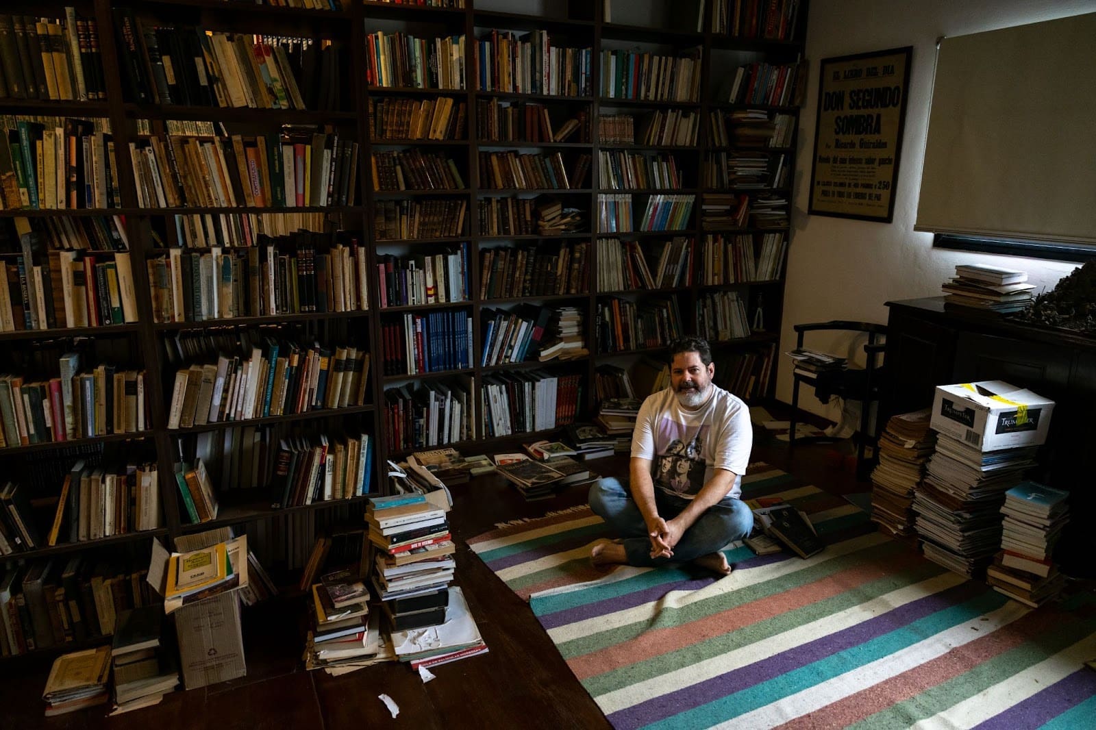 Cuando entramos a la casa de Fernando Martín Peña, en Villa Madero, lo primero que nos advierte es que además de su increíble colección de películas, tiene dos bibliotecas: “Una biblioteca personal y otra profesional. La más importante es la que está en el primer piso. Y hay otra en el fondo de la casa”. Subimos por la escalera y llegamos a un espacio amplio en el que trepan estanterías por distintas paredes, solo interrumpidas por algunas ventanas y puertas (detrás de una de ellas hay una pequeña sala de cine). Vemos un pasillo largo con una biblioteca del piso al techo y rincones aprovechados con más estantes. Está también su escritorio de trabajo, ante un ventanal que da a un amplio jardín con un cactus gigante, que lanza sus últimas flores al pasto, donde dormitan algunos de sus ocho gatos.
