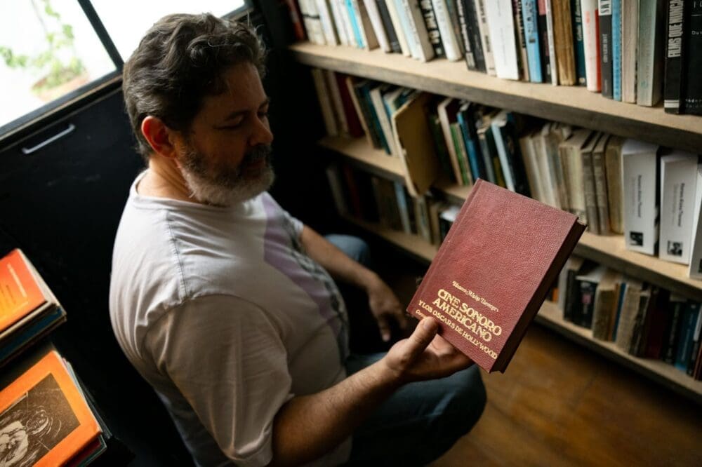 Sí, algo hay. Yo leía mucho sobre cine de joven y todo eso está acá. Por ejemplo, con este libraco aprendí a leer la imprenta minúscula. [Muestra un volumen de tapas rojas llamado Cine sonoro americano y los Oscars de Hollywood, claramente no es un libro “infantil”]. Solo sabía leer la imprenta mayúscula a los cuatro años. Entonces me puse a practicar despacito con esto, y no entendía nada [risas].