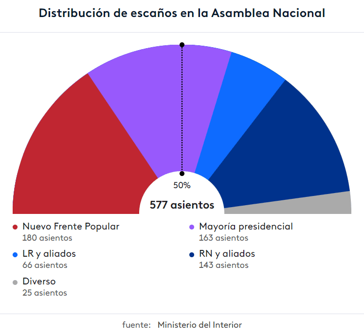 Un dato ad hoc: si el presidente “llama” a formar gobierno a la fuerza más numerosa del parlamento, en este caso NFP, pero esta no tiene mayoría absoluta, ¿puede aparecer un reagrupamiento de bancadas que la destrone? No suena viable. El camino parece allanado para la izquierda. Pero tendrá que mantenerse unida.