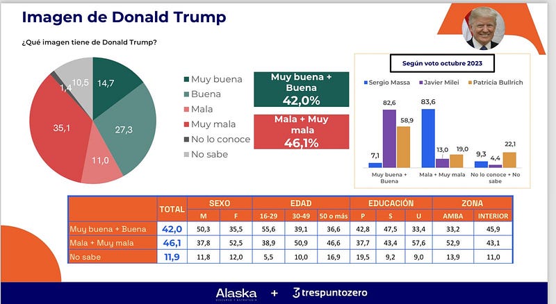 Casi 9 de cada 10 votantes de Milei tienen buena imagen de Trump. El mismo porcentaje de los votantes de Sergio Massa en las generales de octubre pasado tienen mala imagen del magnate. Entre los electores de Patricia Bullrich, la preferencia por Trump baja al 50%. El polo de atracción o rechazo es el líder republicano, porque los números respecto a Kamala Harris, la candidata demócrata, son equilibrados en un punto: 60% no tienen opinión o no conocen a la actual vice de Joe Biden.