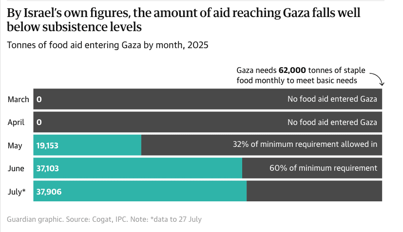 Pero hay algo más inquietante: esto no es nuevo. En 2006, un asesor del gobierno resumió la política como “poner a los palestinos a dieta, sin matarlos de hambre”. Ya en 2008, Israel elaboró un documento interno en el que calculaba el número exacto de calorías diarias necesarias para evitar malnutrición masiva en Gaza: 2.279 por persona, según los estándares de la OMS. El objetivo, como reveló The Guardian en su momento, no era garantizar el bienestar, sino mantener a la población “en el umbral de la crisis” sin traspasarlo. Un bloqueo alimentario técnicamente calibrado, justificado como medida de presión sobre Hamas, pero que afectaba a toda la población civil.