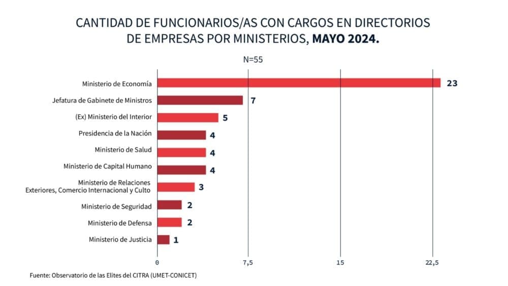 En total, son 55 los funcionarios de rango superior –ministerios, secretarías y subsecretarías– que tienen 182 participaciones declaradas ante la IGJ en directorios de sociedades anónimas, sociedades de responsabilidad limitada y sociedades extranjeras, entre otras. Y si bien Economía es el Ministerio con más casos (23 funcionarios), aparece seguido de cerca por la Jefatura de Gabinete (7 funcionarios) y el ex Ministerio del Interior (5 funcionarios), aunque aparecen ejemplos en prácticamente todas las áreas de la administración.