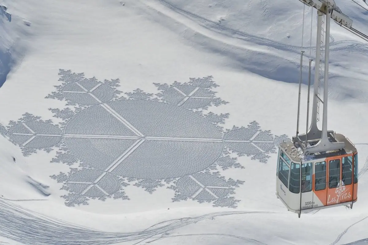 Para ilustrarlo, encontré unas imágenes bastante impresionantes de algo que se llama snow art y que fue creado por un tal Simon Beck, un ex cartógrafo inglés fanático del esquí. Él inventó una forma de dibujar en la nieve sobre grandes superficies armando diseños en escala y luego pasándolos al hielo con sus propios pasos. O sea que dibuja con los pies (a veces ayudado por raquetas de nieve o un bastón de esquí), caminando durante horas, para armar tramas geométricas repetitivas que solo se aprecian desde lo alto. Es un tipo de arte efímero el suyo, porque cuando se derrite la nieve sus trazados obviamente desaparecen. También me impacta el hecho de que, para verse bien, los dibujos dependan de la sombra que se proyecta sobre ellos. Si miran bien la foto que sigue, ahí se lo ve a él, pequeñísimo y empeñado, en medio de una llanura blanca y prolija que se rinde ante las formas que imaginó. Si quieren saber más de su curiosa forma de trabajo a la intemperie, pueden leer esta entrevista que le hicieron para MyModernMet.