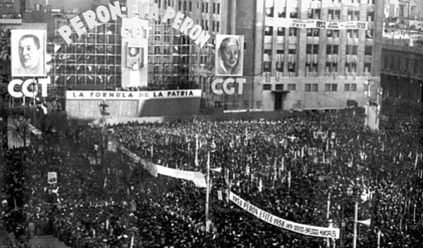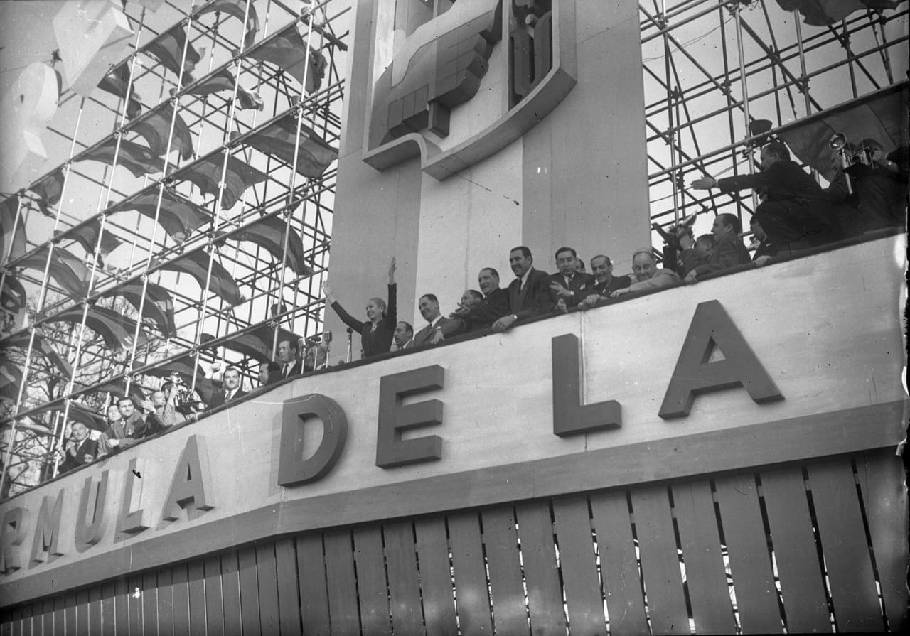 Son las cinco de la tarde. El escenario, ubicado sobre la avenida 9 de Julio y a espaldas del entonces Ministerio de Obras Públicas, lo dice todo: “Perón — Eva Perón”; “CGT”; “La fórmula de la Patria”. No hay nada más que saber. La avenida se va llenando. La edición vespertina de La Razón describe la llegada de los manifestantes. “Amaneció prácticamente vestida de fiesta, profusamente embanderada y recorrida sus calles por alegres caravanas llegadas desde los más apartados rincones de la República. (…) Por un momento, pareció como si el país entero vibrara en una caja de resonancia”. Quién iba a querer perderse el momento histórico. (Un hermoso material de archivo a color sobre la llegada de la gente puede verse aquí).