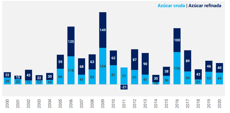 La capacidad de exportar sirve como una forma de descomprimir el mercado interno, ya que ante una producción muy abundante, el precio interno podría caer mucho, perjudicando a la industria. Para cerrar el frente externo, Argentina cuenta con la Ley N° 25.715 que impone aranceles mayores para la importación, protegiendo la industria local (en breve volvemos a esto). En conjunto, esto resulta en un saldo comercial positivo constante del complejo azucarero argentino.