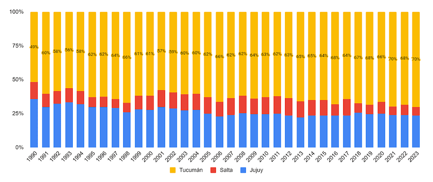 Como te comentaba más arriba, la producción azucarera en nuestro país está sumamente concentrada en tres provincias (Tucumán, Salta y Jujuy) que producen en conjunto aproximadamente el 99%, mientras que lo restante proviene de Misiones y Santa Fe. A su vez, las diferencias entre ellas en cuanto al nivel producido son muy importantes: Tucumán representa el 70% del total.