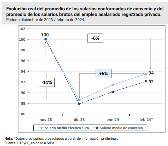 Al respecto, si bien se estuvo hablando mucho acerca de la caída récord del RIPTE (Remuneración Imponible Promedio de los Trabajadores Estables), este no es el mejor indicador para mostrar la evolución de los salarios de los trabajadores registrados. En cambio, es más preciso observar la evolución de los salarios del empleo registrado privado del SIPA (Sistema Integrado Previsional Argentina), el cual sigue mostrando una caída aunque menos fuerte. En cualquier caso, desde la devaluación oficial de diciembre, el poder adquisitivo de los salarios se deterioró.
