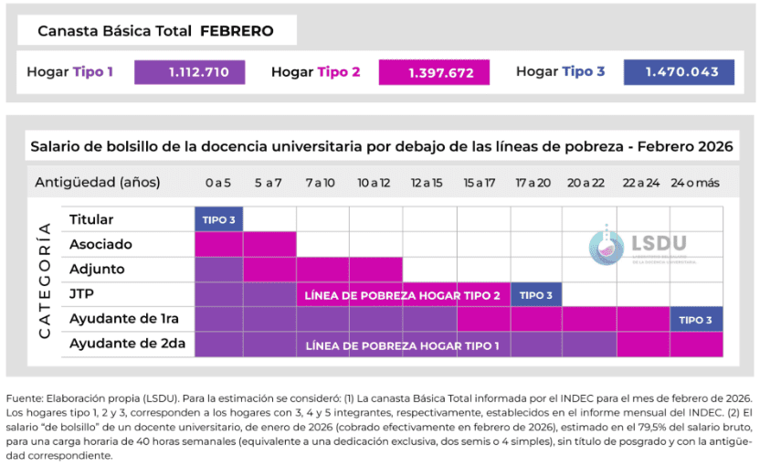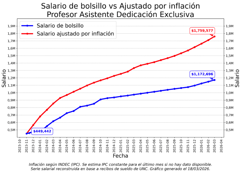 Desde la asunción del gobierno de Javier Milei en diciembre de 2023 la situación se vuelve cada día más grave: No sólo no hay fondos para investigación, además estamos perdiendo docentes todos los días y eso se debe a que los salarios están en la mayoría de los casos por debajo de la línea de la pobreza. Como ejemplo, con datos actualizados a marzo de 2026, para que un profesor gane lo mismo que en diciembre de 2023 ajustado por inflación, el sueldo actual debería incrementarse en un 50,4%.