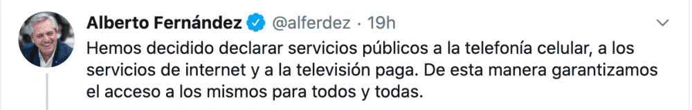 El presidente Alberto Fernández comunicó por Twitter el 21 de agosto pasado que había decidido declarar internet –entre otros– un servicio público.