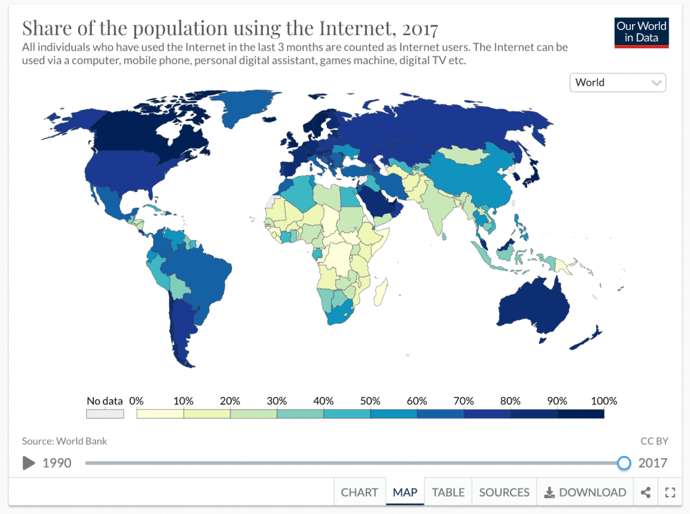 Lo mismo que pasa en Estados Unidos pasa a otra escala en el mundo. Acá podés ver otro mapa con una variable similar, pero distinta: la proporción de gente que usa internet. Otra vez, ese número no es igual en todos lados y su relación con el nivel de desarrollo salta a la vista. Un dato: en 2017 el grupo que menos accedió a internet fue el de las mujeres africanas.