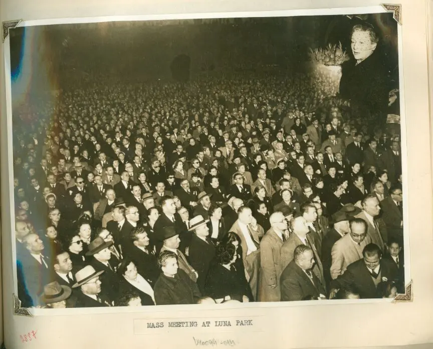 Tres fotografías de este viaje resultan especialmente reveladoras: la primera muestra a Vera Weizmann en un Luna Park colmado por 20.000 personas que acudieron para escucharla; la segunda la presenta en el Plaza Hotel pronunciando un discurso con una fotografía de Perón y otra de Itzhak Ben-Zvi (presidente de Israel en ese entonces) a sus espaldas; la tercera, quizás la más simbólica, captura a Vera frente a un retrato enmarcado de Eva Perón en la Ciudad Infantil, uno de los proyectos emblemáticos de la Fundación Eva Perón, en un momento de conmemoración. Este gesto cobraba especial significado considerando que apenas un año antes, Golda Meir, entonces Ministra de Trabajo de Israel, había viajado personalmente a Argentina para expresar su gratitud a Eva Perón por las generosas donaciones hechas a través de su fundación.