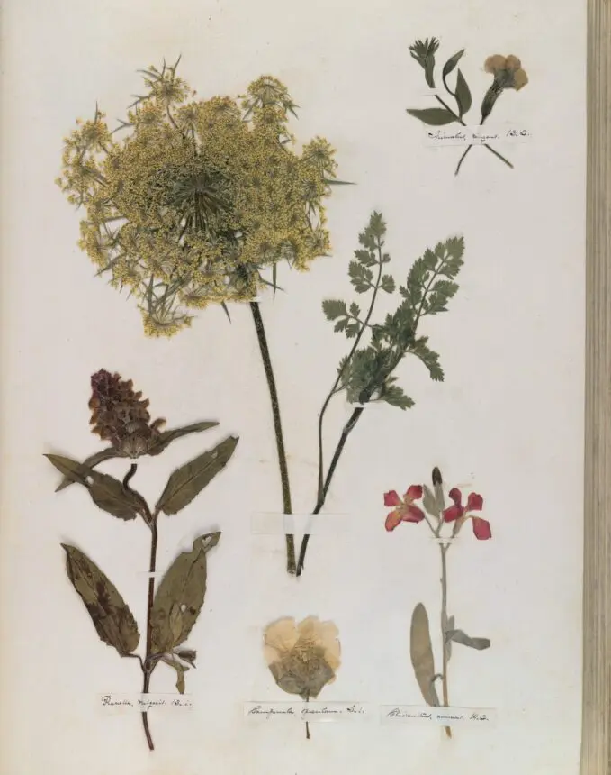Una buena forma de acercarnos al jardín es reparar en los herbarios, esas minuciosas colecciones de plantas que fueron seleccionadas, recolectadas y conservadas, acompañadas de alguna anotación. Los herbarios son el testimonio material de esos espacios verdes que fueron visitados. Son la huella del pasaje de las personas por sitios llenos de plantas y flores sencillas o exuberantes. Ya casi nadie lleva su propio herbario, pero era una tradición interesante en los siglos XIX y comienzos del XX. Uno de los más célebres es el de la poeta norteamericana Emily Dickinson (1830-1886), que consta de 424 plantas prensadas que recolectó entre sus 9 y sus 16 años, dispuestas en un álbum de tapas verdes. Ese álbum original se conserva en la biblioteca de libros raros de Harvard, pero su estado es muy delicado y ya nadie puede tocarlo ni examinarlo de cerca. Por suerte sí pudieron digitalizarlo por completo. Desde este link se puede espiar su selección y hacer foco en sus sutilezas. O se puede conseguir una edición en español, bellísima y de tapa dura.