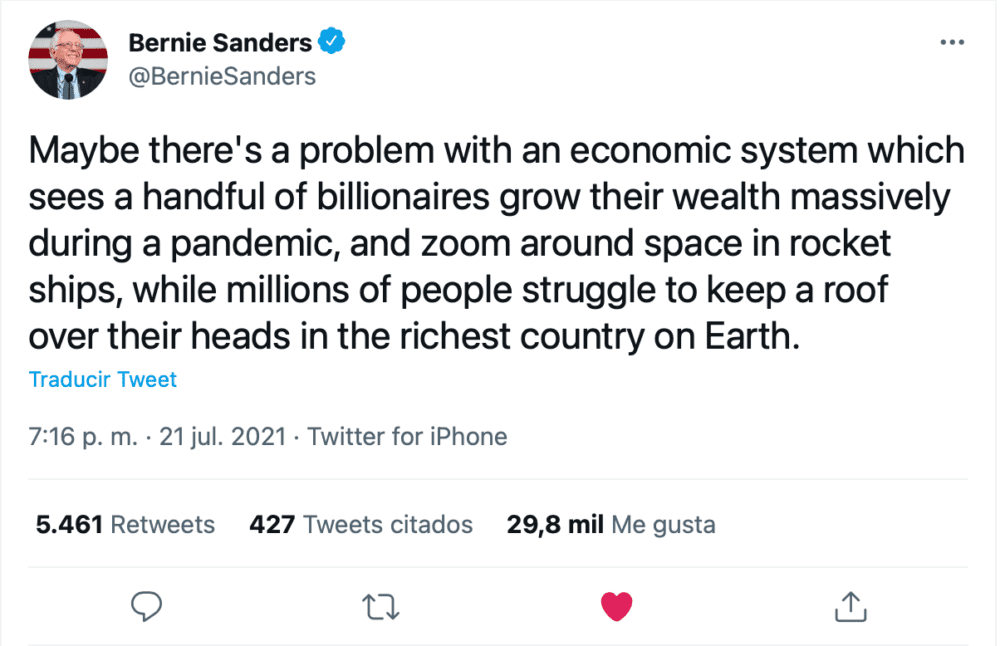 El tuit dice: “Tal vez haya un problema con un sistema económico que ve a un puñado de multimillonarios hacer crecer su riqueza de forma masiva durante una pandemia y volar por el espacio en cohetes, mientras millones de personas luchan por mantener un techo sobre sus cabezas en el país más rico de la Tierra”.