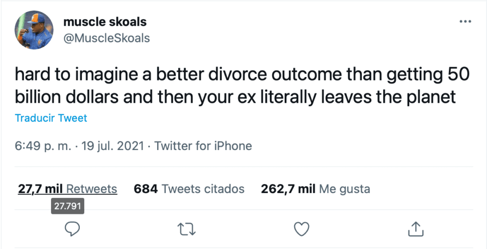 El tuit dice: “Difícil imaginarse un mejor resultado de divorcio que uno en el que te dan 50 mil millones de dólares y después tu ex literalmente se va del planeta”. Esto es en referencia a que Jeff se separó de su mujer, MacKenzie, y efectivamente ella se quedó con bastante plata –por cierto, desde entonces dona una gran proporción, más que su ex marido–.