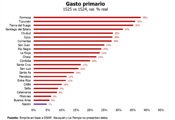 Kicillof habla de la deuda bonaerense como una herencia de la exgobernadora y trata de dar un debate sobre la administración de la provincia que, según un informe de Empiria con datos del primer semestre de 2025, refleja que Buenos Aires fue la administración que menos aumentó su gasto primario comparado con el mismo período de 2024. Pablo López, el ministro de Economía, defendió el endeudamiento con el argumento de que PBA es austera y es, detrás de Córdoba, la provincia con menos empleo público.