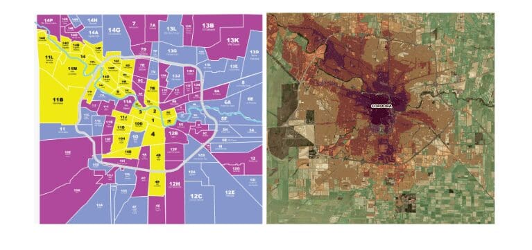 En la ciudad de Córdoba, de la que te hablé hace dos semanas a propósito de la victoria del peronismo, pasó algo similar. Milei le ganó por dos puntos al ex gobernador Juan Schiaretti. Si comparamos el precio del suelo (mapa de la derecha) con los circuitos electorales donde se impuso cada fuerza, vemos que las zonas más ricas -el centro de la ciudad y la expansión en forma de barrios cerrados hacia el noroeste de la ciudad- votaron a JxC, mientras que LLA y el peronismo no kirchnerista de Schiaretti y Randazzo se repartieron en partes casi iguales las zonas de clase media y de bajos ingresos.