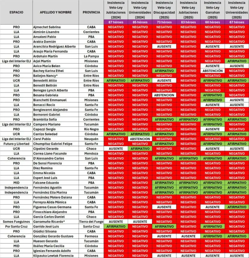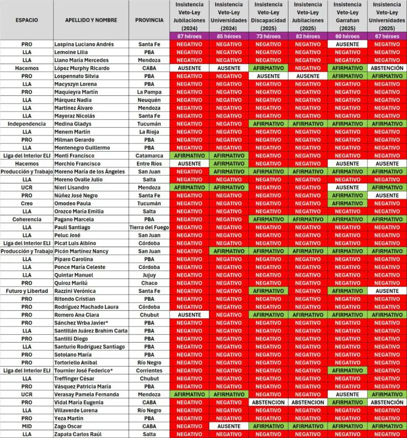 Legisladores que integran el interbloque LLA, como la tucumana Paula Omodeo, la mendocina Pamela Verasay o los radicales con peluca como el correntino Federico Tournier y el tucumano Mariano Campero, que supieron integrar el club de los 87 héroes, esta vez votaron contra el veto de Milei. De los 34 diputados del PRO, solo 22 se alinearon con la postura que bajó Cristian Ritondo. Hubo un espadeo público con Silvia Lospennato, que reporta a Mauricio Macri, y votó en contra.
