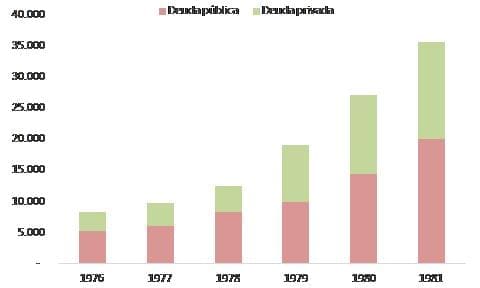 Si bien es imposible negar la relevancia del Rodrigazo como elemento desestabilizante de la economía (dicha devaluación fue 4 veces superior a la más alta que se había registrado hasta ese entonces), con eso no alcanza para explicar un proceso sostenido de declive. Algo similar se puede decir del nivel de conflicto social de esa época, que en buena medida fue reprimido violenta y trágicamente por las fuerzas militares del Estado. Nos falta un componente cuyo impacto negativo haya perdurado lo suficiente en el tiempo como para afectar el crecimiento económico por varios años. Y ahí aparece la deuda en moneda extranjera y la “obsesión” por la compra de dólares.