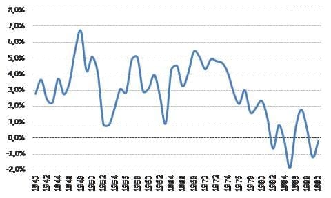 El quiebre más significativo que trajo aparejado el gobierno de facto fue el fin del crecimiento económico, como se puede ver en el gráfico a continuación. Salvo por los años afectados por la gran crisis internacional de los ’30, la economía argentina sostuvo tasas de crecimiento positivas –y en muchos años elevada- hasta 1975. Ese año es, en realidad, donde podemos ubicar el quiebre, tras el “Rodrigazo” (la devaluación de más del 300% en el tipo de cambio que aplicó Celestino Rodrigo, el ministro de Economía del gobierno de Isabel Perón).