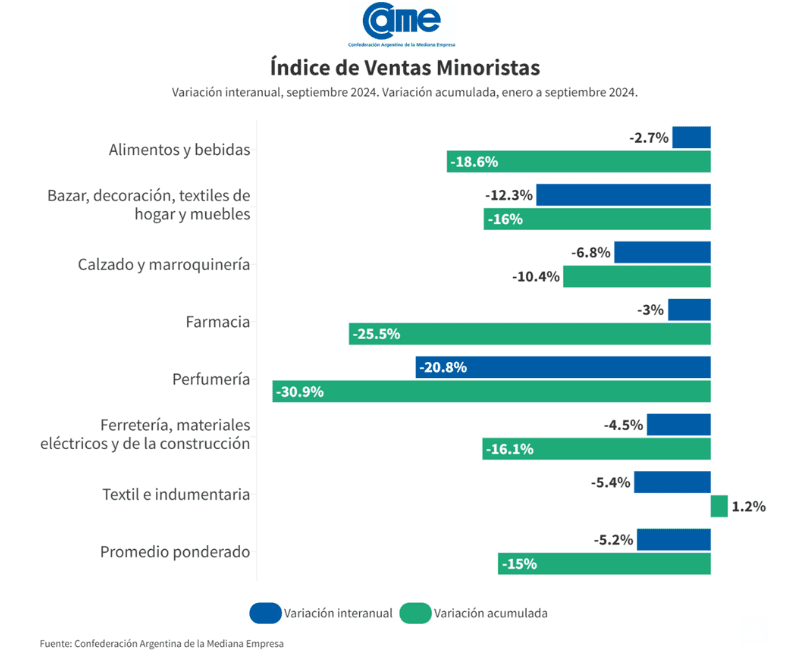 El consumo masivo está lejos de recuperarse. La Cámara Argentina de la Mediana Empresa (CAME) midió que las ventas minoristas cayeron 5,2% anual y 0,5% mensual en septiembre, y acumulan una retracción del 15% en 2024. La contracción se reduce desde los picos de junio (-22%), pero las ventas siguen en terreno negativo en los siete rubros relevados. La venta de alimentos disminuyó un 2,7% anual y acumula un retroceso de casi 19% en el año. Los rubros de farmacia y perfumería acumulan bajas de entre 25 y 30%.